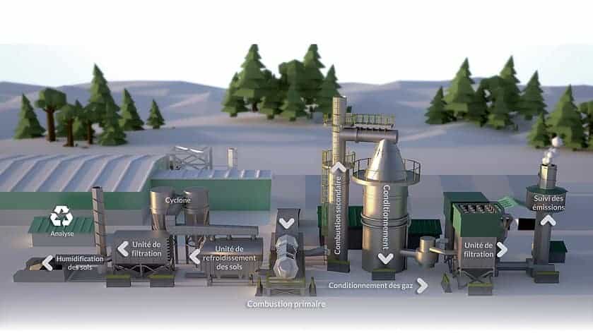 Les sols contaminés et les MDR sont acheminés dans le four rotatif (chambre de combustion primaire) par un convoyeur à courroie et des vis sans fin afin de pouvoir contrôler précisément le débit d’alimentation. Pour s’assurer que la désorption thermique soit optimale, le four rotatif est maintenu à des températures supérieures à 650 °C. Après plus de 20 minutes enfermées dans ce four, toutes les matières organiques contenues dans les sols et les MDR sont désorbées puis évaporées. Les gaz contenant les contaminants organiques sont entraînés dans la chambre de combustion secondaire, qui est maintenue à une température supérieure à 1 000 °C. À cette température, les composés organiques dangereux (contaminants) sont détruits par oxydation thermique. Par la suite, les gaz oxydés passent par la tour de refroidissement où, en moins de trois secondes, les températures sont réduites à moins de 200 °C par l’injection d’eau. Cette étape de refroidissement est exécutée très rapidement pour éviter la reformation de sous-produits de combustion (dioxines, furannes, HAP). Par la suite, de la chaux hydratée et du charbon activé sont injectés aux gaz refroidis. La chaux hydratée a pour fonction de neutraliser les gaz acides et le charbon activé ajoute une sécurité supplémentaire en absorbant les composés organiques présents. Finalement, les gaz sont épurés dans le système de filtration pour y enlever toutes les particules fines puis sont relâchés à la cheminée. Les concentrations pour six gaz évacués sont lues en continu à l’aide d’un appareil de mesure à la fine pointe de la technologie afin de s’assurer du respect des lois et règlements en vigueur.
